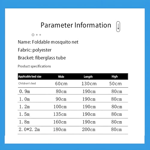 - تبلغ أبعاد ناموسية السرير 1.80 م × 2.00 م × 80 سم، مما يوفر تغطية واسعة لسرير قياسي، وتتوفر بأحجام متعددة، بما في ذلك 1.35 م × 1.90 م × 80 سم و1.60 م × 1.90 م × 80 سم، مما يضمن ملاءمة مثالية لمختلف أنواع السراير وأحجام الغرف، مما يجعلها متعددة الاستخدامات لمختلف البيئات.