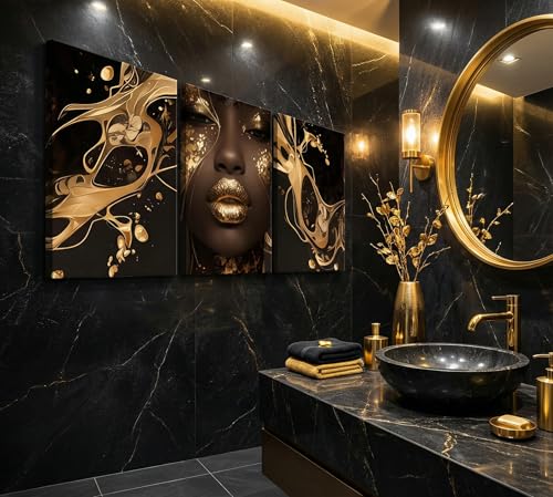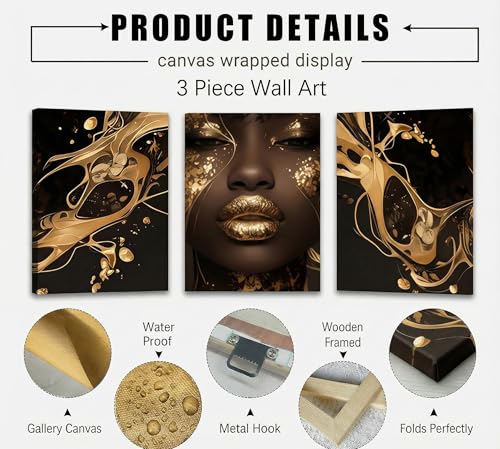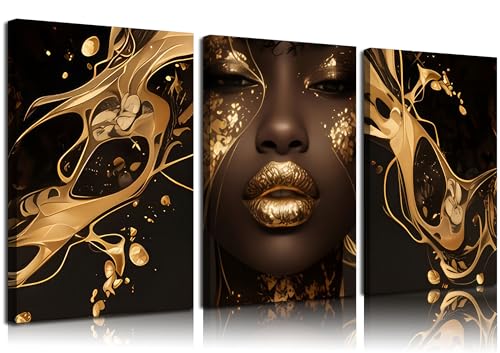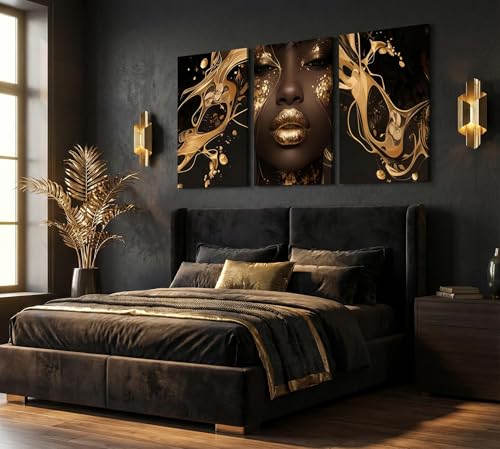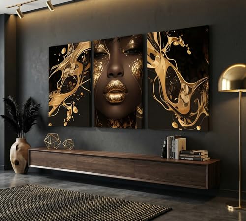 لوحات فنية جدارية قماشية بنمط نساء أميركية سوداء من إفريقيا باللونين الأسود والذهبي من 3 قطع، صور تجريدية سوداء وذهبية، بوستر طباعة عمل فني لغرفة المعيشة وغرفة النوم وديكور المنزل جاهز للتعليق