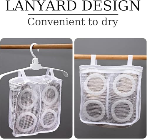 شنطة غسيل أحذية شبكية بتصميم قابل للتعليق، شبكة واقية للغسالة باللون الأبيض، 4 مساحات تخزين