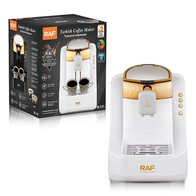 ماكينة صنع القهوة التركية بسعة 2 كوب RAF (R.111) /خزان سعة 0.8 لتر/صينية مياه الصرف/تنظيف ذاتي/700 واط (ابيض)