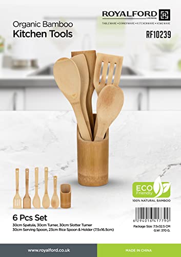 أدوات مطبخ من الخيزران العضوي من رويال فورد، RF10239 | ملعقة سباتولا وملعقة تقليب مشقوقة وملعقة تقديم وملعقة أرز وحامل | طقم أدوات مطبخ غير لاصقة | أدوات طهي غير قابلة للخدش