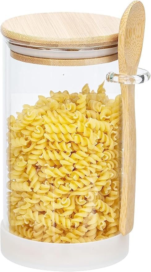 علبة تخزين طعام زجاج مع غطاء من خشب البامبو وملعقة، علبة مطبخ للمكرونة، سعة 1 لتر