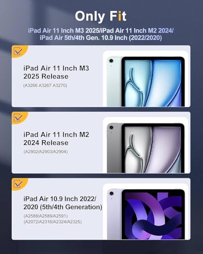 - توافق مثالي: مصمم ليناسب جهاز اي باد اير 11 بوصة (M3/M2) 2025/2024 (رقم الموديل: A3266/A3267/A3270/A2902/A2903/A2904)، ايباد اير الجيل الخامس/الرابع 2022/2020 (رقم الموديل: A2588/A2589/A2591/A2072/A2316/A2324/A2325). يرجى التحقق من الجزء الخلفي لاي بادك للعثور على رقم الموديل.