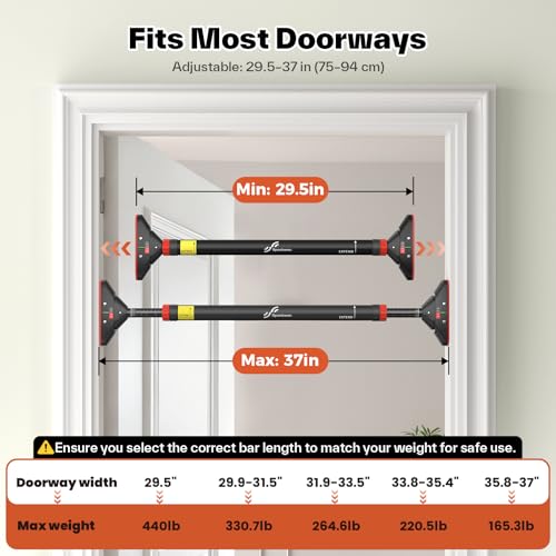 - قبل الشراء، يرجى التأكد من أن مقاس إطار بابك هو 29.5 انش - 37 انش (75 سم - 94 سم). قضيب الذقن هذا غير مناسب لعرض إطار الباب خارج هذا النطاق؛ يجب أن يكون عرض إطار الباب أوسع من عرض الوسادات المضادة للانزلاق في كلا طرفي قضيب السحب