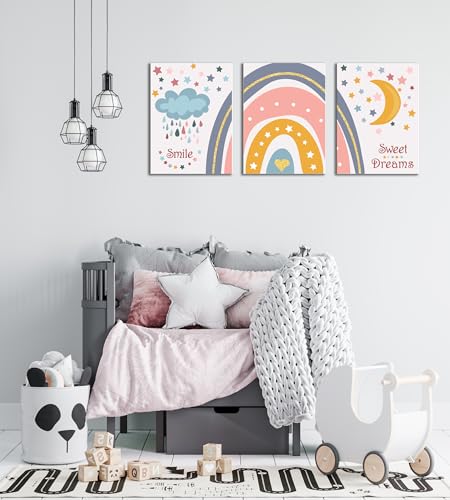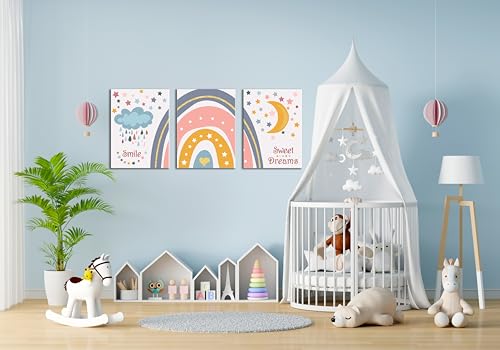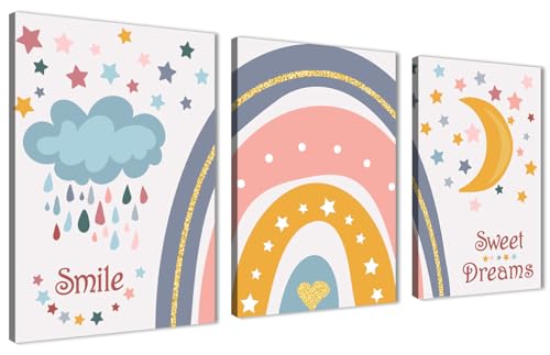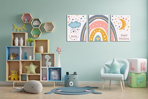 تابلوه لغرف الاطفال بتصميم عناصر طفولية مرحة مثل قوس قزح و سحابة ممطرة و قمر ونجوم - تعلق على الحائط لتزيين الغرفة وديكور المنزل - مقاس (30 سم × 40 سم × 3 قطع) من سكيلز