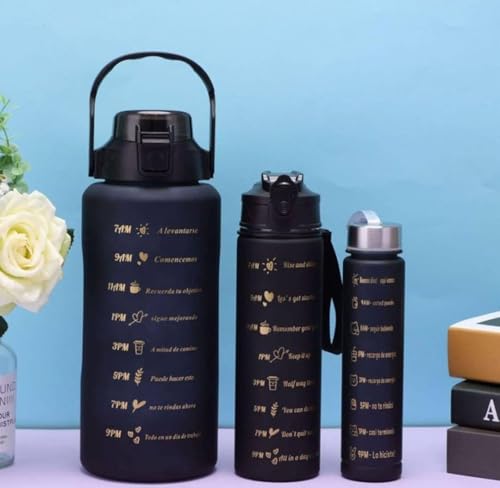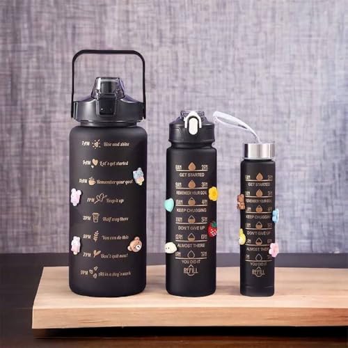 زجاجة مياه بعبارات تحفيزية من الفولاذ المقاوم للصدأ لون أسود، 2 لتر/1 لتر/500 ملليلتر، علامات للوقت وملصقات ومقاومة للتسرب، محمولة، مجموعة من 3 قطع