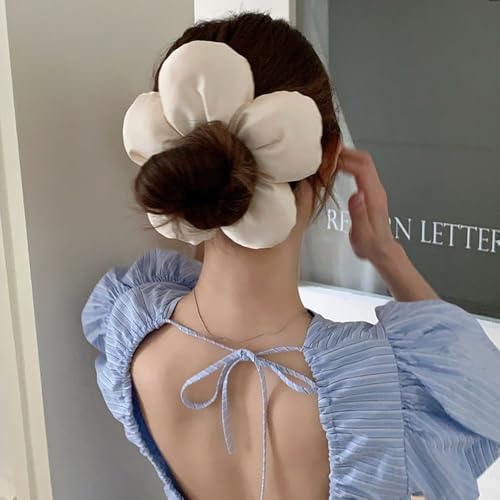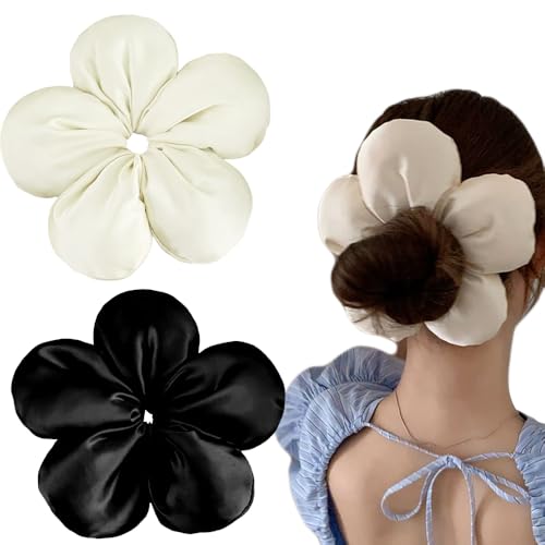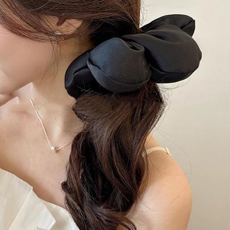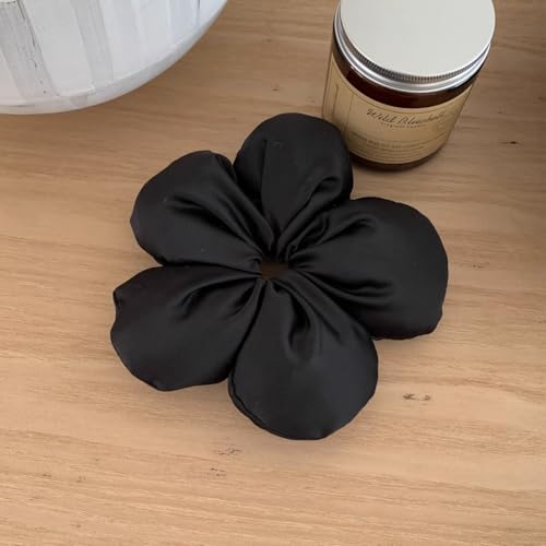 توك شعر كبيرة من الساتان على شكل زهرة اكسسوارات شعر حديثة من كوريا للشعر الكثيف والمجعد للنساء، لون أسود وبيج