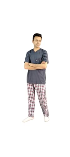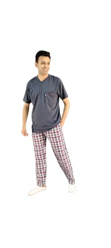 بيجامة صيفي رجالي سادة بأكمام قصيرة ورقبة سبعة وبنطلون كاروه- رمادي غامق