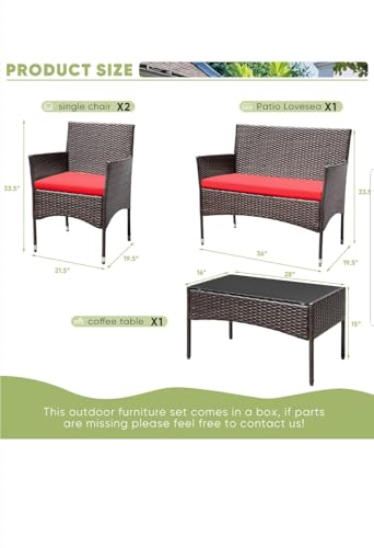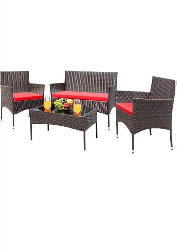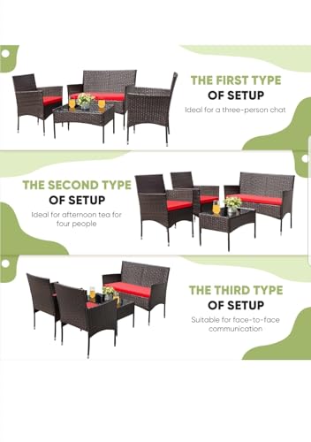 روبابيكيا مجموعة اثاث الفناء مكونة من 4 قطع كراسي الخيزران الخوص في الهواء الطلق للحديقة والفناء الخلفي والشرفة وجانب حمام السباحة مع وسادة ناعمة وطاولة زجاجية بني واحمر