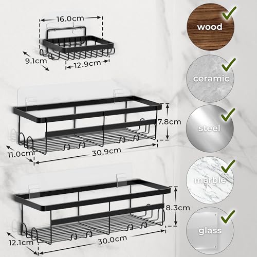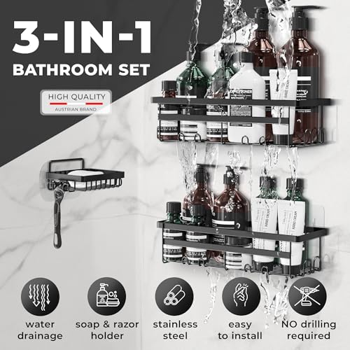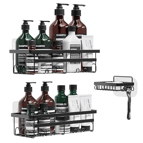 مجموعة أرفف دش من 3 قطع - رف حمام بدون ثقب، رف حمام من الفولاذ المقاوم للصدأ، 2 رف حمام +1 طبق صابون مقاوم للصدا والانزلاق، سلة دش للحمام مع ملصق سحري للشامبو