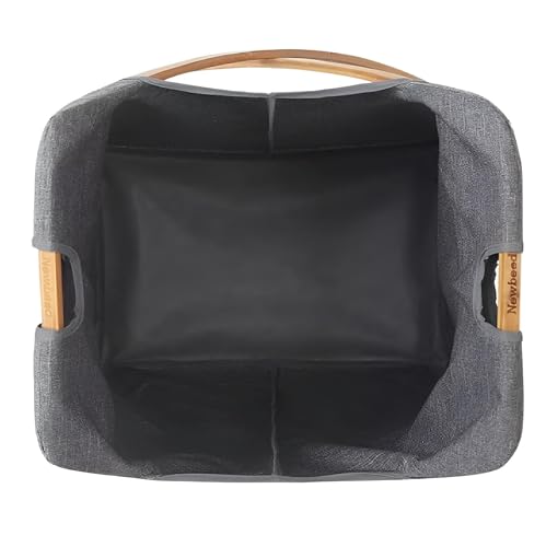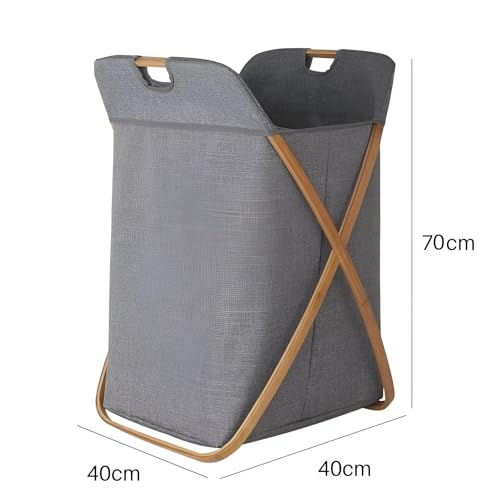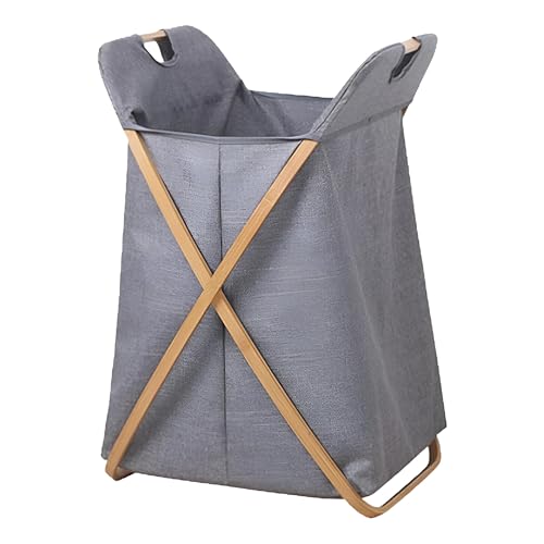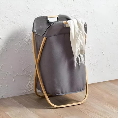 سلة ملابس - سلة غسيل كبيرة قابلة للطي من القماش باللون الرمادي تتميز بتفاصيل خشبية طبيعية، مثالية لادارة خزانة الملابس المنزلية بكفاءة