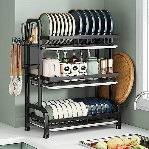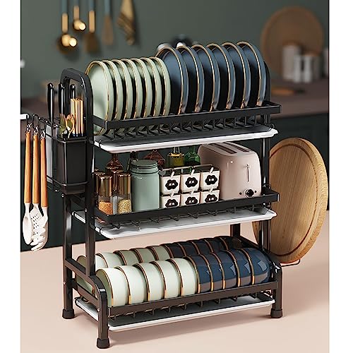 رف تجفيف الأطباق من 3 طبقات منظم أطباق المطبخ الستانلس ستيل موفر للمساحة 43 سم × 24 63.5 حامل لتجفيف لوح التقطيع تصريف تخزين أسود