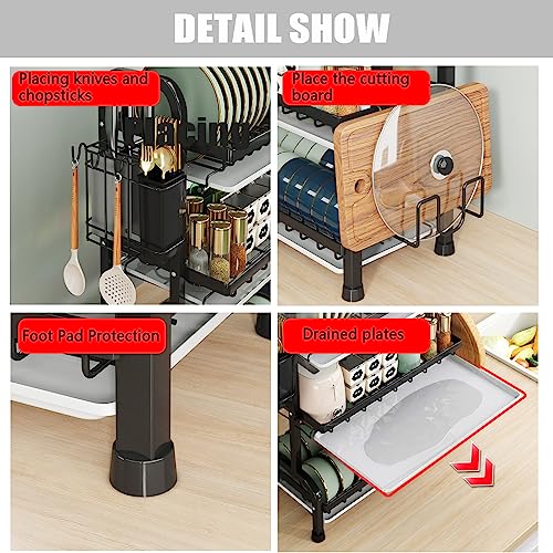 - 【توازن قوي وقابل للتعديل】هيكل رف تجفيف الأطباق من طبقتين "R"" يمنع رف تجفيف الأطباق الأسود من الإمالة للأمام ويثبت رف التجفيف بوزن أقصى يصل إلى 44 باوند؛ أقدام سيليكون تضبط الارتفاع لتناسب أنواع مختلفة من أسطح الطاولات وتمنع الخدوش