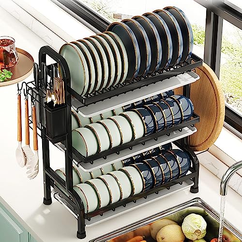 - 【سعة كبيرة بهيكل صغير】رف تجفيف من 3 طبقات للمطبخ يمكنه وضع 40 وعاء و17 طبق، رف أدوات المائدة الأيسر لوضع أدوات المائدة، رف لوح التقطيع الأيمن، سعة كبيرة لوضع أدوات المائدة العائلية، يوفر مساحة مطبخك القيمة؛ مقاس رف الأطباق الصغير 43 سم × 24 × 63.5 سم