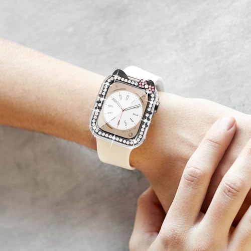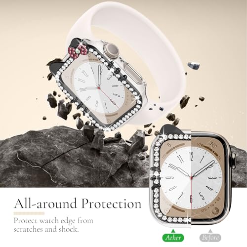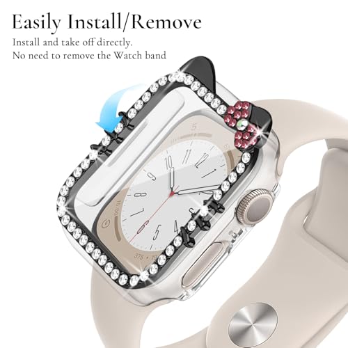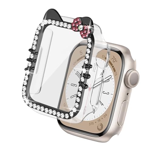 جراب حماية لساعة آبل ووتش بتصميم كرتوني لامع لقطة مزينة بفيونكة وألماسات كريستال لحماية كاملة للساعة والشاشة مع شاشة حماية من الزجاج المقوى لآبل ووتش SE وسلسلة 9/8/7/6/5/4 40 و41 ملم من وات برو
