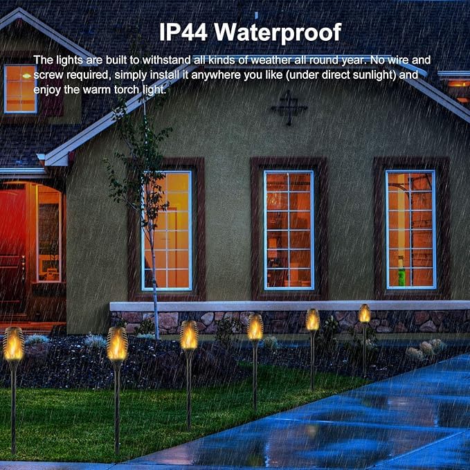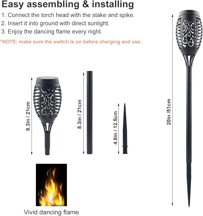 - تستخدم على نطاق واسع: كشافات يدوية مزود بشعلة تعمل بالطاقة الشمسية مناسبة للاستخدام الخارجي ومثالية للمنزل والحديقة والفناء والممر والمناظر الطبيعية وديكورات الحديقة ولتخييم والشواء وحفلات الزفاف والكريسماس والهالووين وغيرها من الاحتفالات لتوفير جو مثالي لإشعال النار وقت التخييم.