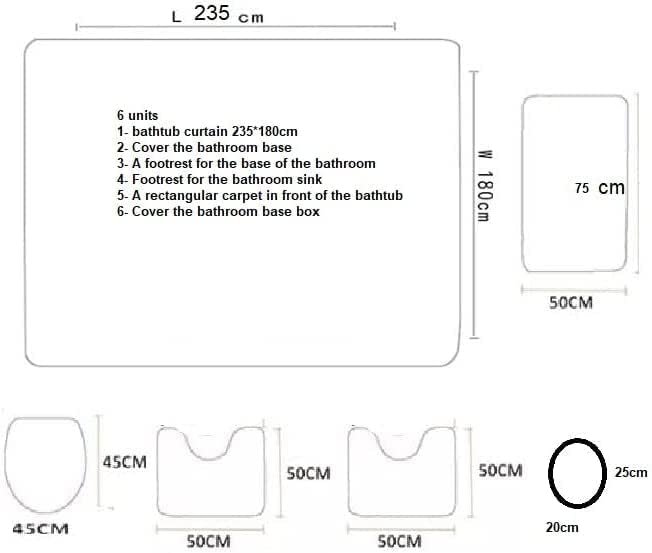 - 1- ستارة بانيو 235 سم فى 185 سم مطبوعة ثرى دى مصنوعة من البوليستر والستان المقاوم لامتصاص الماء ومعتمة الرؤية 2- دواسة حمام مستطيلة للبانيو مطبوعة ثرى دى طبقة مقاومة للتزحلق الطول 80 سم × العرض 50 سم. 3- دواسة حوض الوش حرف U مطبوعة ثرى دى طبقة جلد ضد التزحلق الطول 50 سم × العرض 50 سم. 4- دواسة قاعدة التواليت بتصميم حرف U مطبوعة ثرى دى طبقة جلد مقاومة للتزحلق الطول 50 سم × العرض 50 سم. 5- مع غطاء بيبة حمام دائرية 25 سم مطبوعة ثرى دى طبقة جلد مقاومة للتزحلق