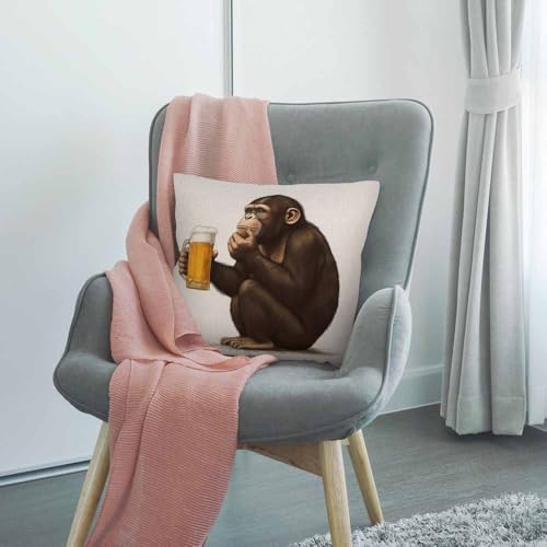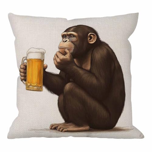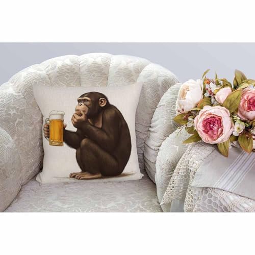 كيس مخدة تصميم غوريلا، كيس مخدة ديكور تصميم قرد يجلس وينظر بتركيز لكأس من البيرة، أكياس مخدة مربعة من القطن والكتان لكنبة المنزل 46 × 46 سم، بني من اتش جود ديزاينز