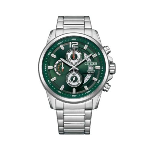 ساعة كوارتز كرونوغراف للرجال بمينا أخضر وسوار من الفولاذ المقاوم للصدأ من سيتيزين، AN3690-56X