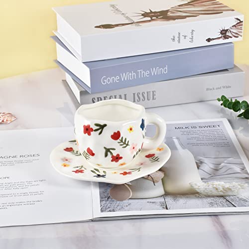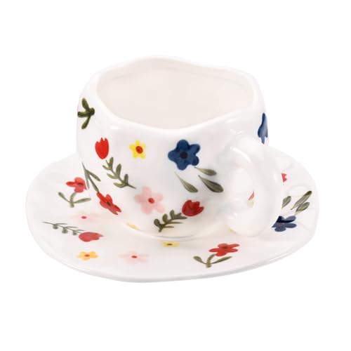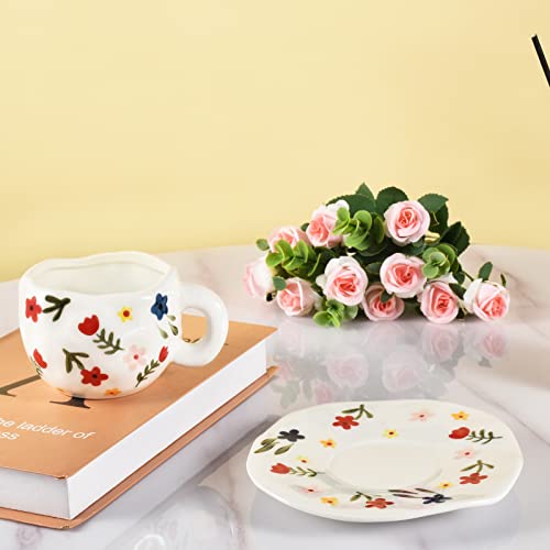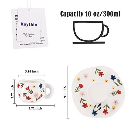 كوب عريض مع مقبض وصحن من كويثين، مصنوع من الخزف، سعة 10 أونصة، باللون الأبيض الفلوريت، آمن للميكروويف وغسالة الأطباق ومقاوم للبقع، عدد القطع: 1