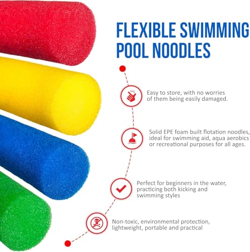 - عوامات نودلز من فوم عالي الجودة: نودلز حمام السباحة الخاصة بنا مصنوعة من فوم عالي الجودة يضمن طول العمر والمتانة. ستوفر هذه النودلز الصنوعة من الفوم ساعات لا حصر لها من المرح، سواء في حمام السباحة أو البحيرة أو الشاطئ. ألوان متنوعة - تتضمن العبوة لونين تم اختيارهما عشوائيًا من الأزرق والأرجواني والأصفر والأحمر.