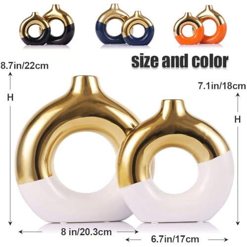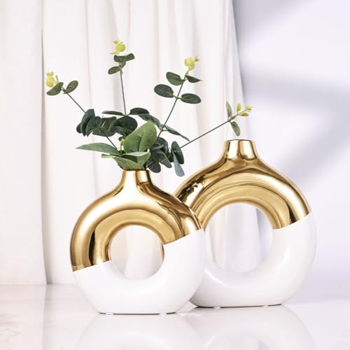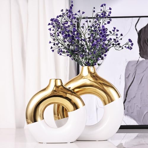 مجموعة مزهرية سيراميك بيضاء وذهبية من قطعتين، مزهرية زهور لديكور المنزل، مزهرية دونات للرف، مزهرية بوهو عصرية للديكور، مزهرية عشب بامباس مستديرة، مثالية لطاولة الطعام والرفوف والقطعة المركزية