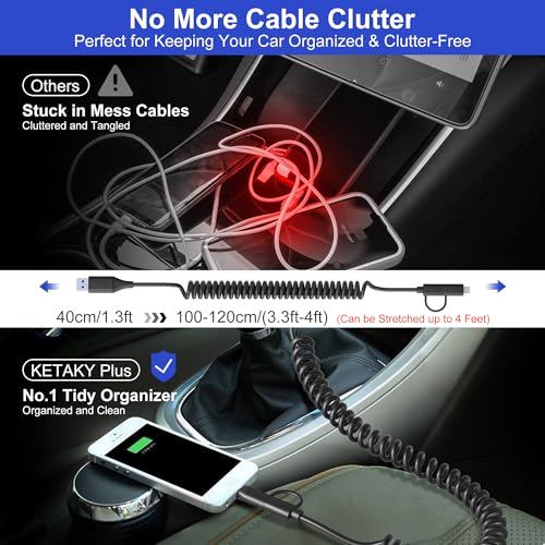 - محتويات العبوة: 1 × كابل USB نوع ايه ونوع سي إلى نوع سي ولايتنينج بطول 30 سم (قابل للتمدد حتى 91 سم، طول خياطة مريح 46 سم قدم - 61 سم، ويرتد إلى الطول العادي). قل وداعًا للفوضى واحتفظ بالأسلاك بعيدًا عن طريق سيارتك. المميزات: - -