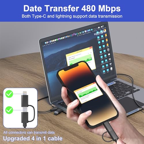 - كابل شحن 4 في 1: تم تصميم كابل الشاحن المتعدد بهدف تبسيط حياتك. يجمع بين أربعة منافذ: USB نوع سي إلى USB نوع سي (60 وات، 3 أمبير/20 فولت)، وUSB نوع سي إلى لايتنينج (27 وات، 3 أمبير/9 فولت)، وUSB نوع ايه إلى لايتنينج (18 وات 2 أمبير/9 فولت) وUSB نوع ايه إلى USB نوع سي (12 وات، 2.4 أمبير/5 فولت) في كابل واحد. كابل واحد يساوي أربعة كابلات. لن تحتاج لحمل كابلات متعددة لأجهزة مختلفة.