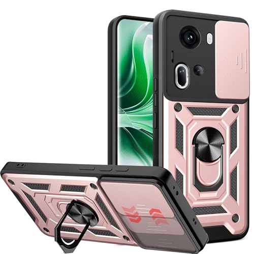 جراب حماية لموبايل أوبو رينو 11 شبكة الجيل الخامس 5G مع غطاء كاميرا منزلق، مضاد للصدمات من الدرجة العسكرية مع مسند حلقي معدني قابل للدوران [يدعم حامل السيارة المغناطيسي] من دلع موبايلك (ذهبي وردي)