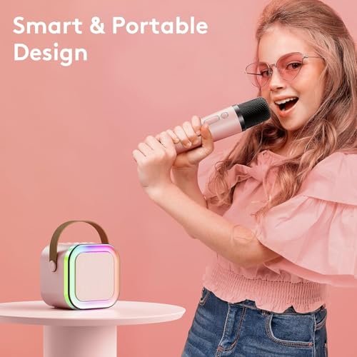 آلة كاريوكي لاسلكية للأطفال، ميكروفون ستيريو للأطفال، مكبر صوت محمول 5 في 1، ميكروفون كاريوكي محمول باليد ومسجل مع ريمكس قابل للتعديل للأطفال والبنات والأولاد والمراهقين (وردي)