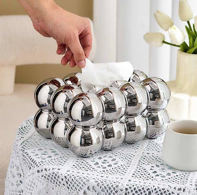 - تصميم أنيق: يضيف حامل المناديل الكروي الفريد بلمسة نهائية فضية معدنية لمسة فاخرة وعصرية لديكور أي غرفة