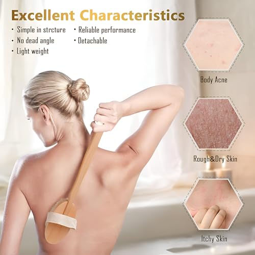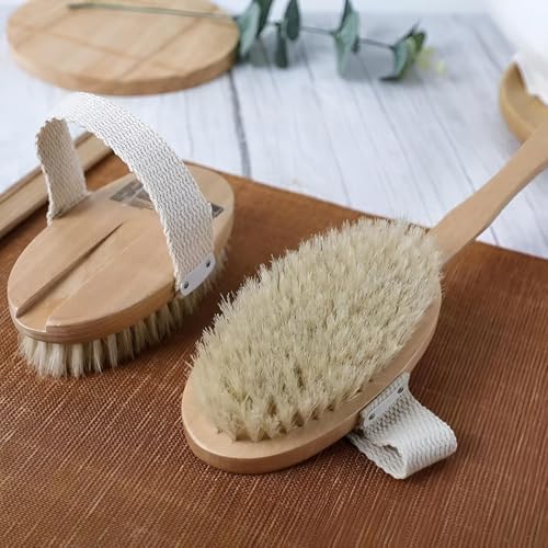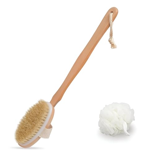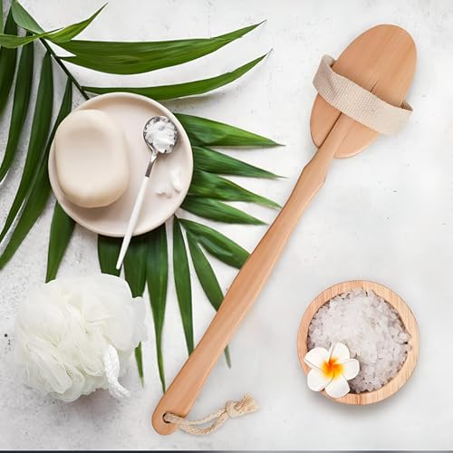 فرشاة للجسم - فرشاة لتنظيف الظهر بمقبض خشبي طويل لوقت الاستحمام أو الدش، مناسبة لتنظيف البشرة الجافة أو الرطبة، تحسن ملمس البشرة وتعزز الدورة الدموية