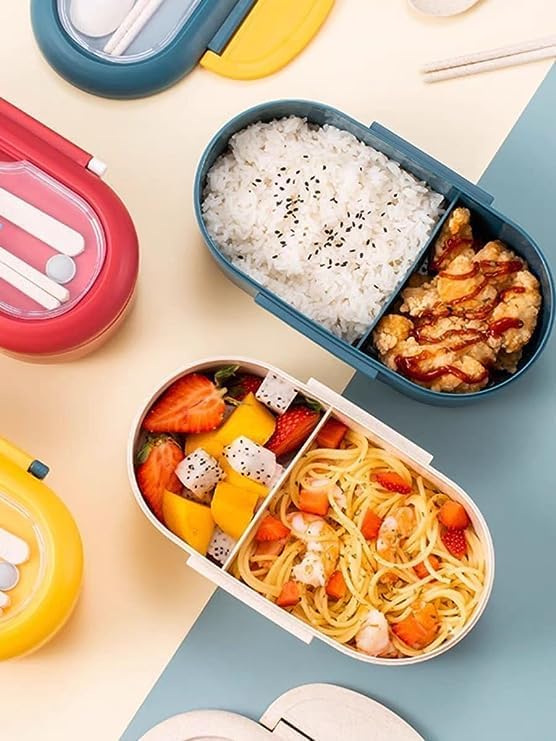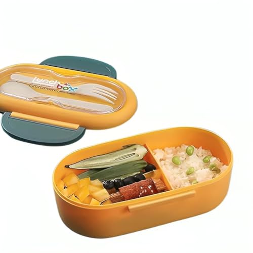 لانش بوكس ولادي وبناتي - حاوية طعام مكون من قسمين مع ملعقة وشوكة -صندوق غذاء مانعه للتسرب خالية البيسفينول ايه ومواد امنة غذائيا وامن للميكروويف اصفر في كحلي