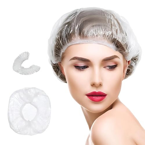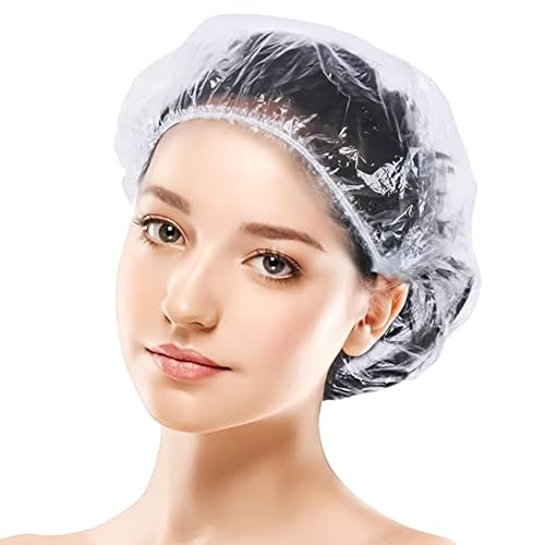 غطاء رأس للاستحمام بتصميم شفاف مقاوم للماء - غطاء بلاستيكي كبير وسميك ومرن للسبا والفنادق والمنزل وصالونات الشعر والتجميل ولأغراض السفر (100 قطعة)