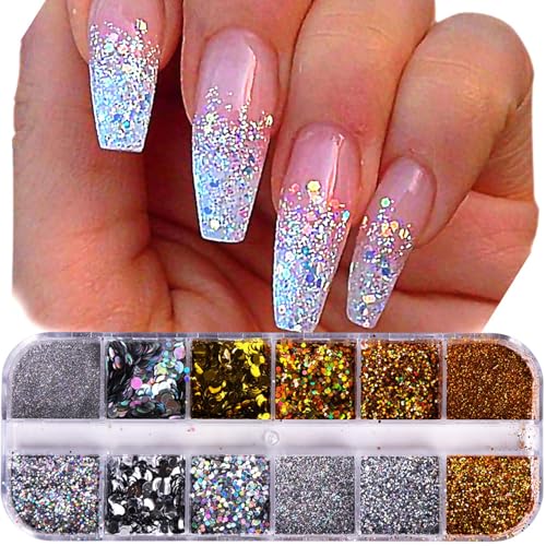 ملمع أظافر ذهبي وفضي من 12 شكل، طلاء أظافر ثلاثي الأبعاد رقيق بالليزر من الاكريليك، جليتر لامع ثلاثي الأبعاد لتزيين الأظافر