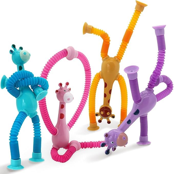 العاب على شكل زرافة بتصميم تلسكوبي ومزودة بقاعدة لاصقة واضاءة ليد العاب انبوبة متغيرة الشكل، العاب بوب حسية للبنات والاولاد، مجموعة من 4 قطع