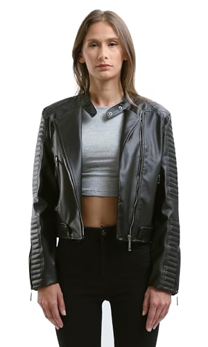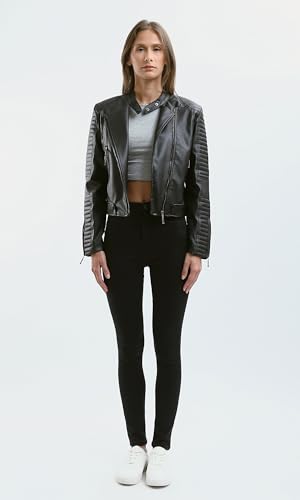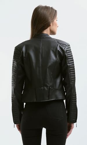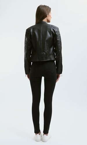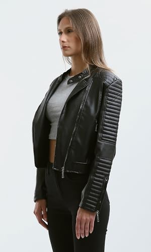جاكيت راكبي الدراجات من الجلد بلون اسود واكمام مخيطة للنساء ريفين