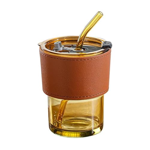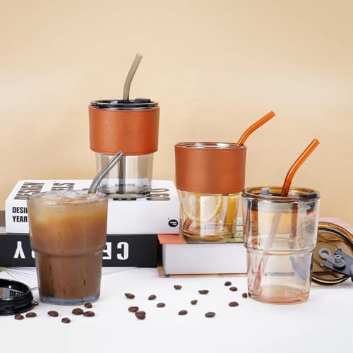 كوب زجاجي للقهوة المثلجة سعة 14 اونصة/400 مل ، كوب زجاجي بغطاء وماصة زجاجية، اكواب مياه لطيفة، اكواب زجاجية معزولة بجدار سميك
