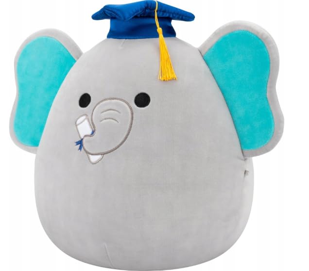 - تصميم التخرج: عروسة فيل رمادية رائعة ترتدي قبعة تخرج زرقاء مع شرابة صفراء، تتميز بأذنين بلون أزرق مخضر وتفاصيل وجه مطرزة.