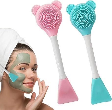 فرشاة سيليكون مزدوجة 2 في 1 لتنظيف الوجه وتطبيق الماسك – فرشاة ناعمة لتقشير البشرة مع ملعقة سيليكون لتوزيع الكريمات والماسكات – تصميم دب لطيف – متعددة الالوان