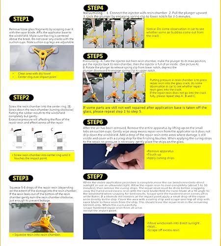 - تتضمن محتويات الصندوق كل ما تحتاجه لإجراء الإصلاحات الأساسية: بخاخ إصلاح الزجاج الأمامي (الحاقن)، راتينج الإصلاح، منصة قاعدة الاستخدام، خمس قطع من الفيلم المستخدم أثناء عمليات التطبيق، شفرة حلاقة لإزالة المكونات/التشطيب.