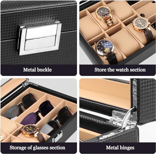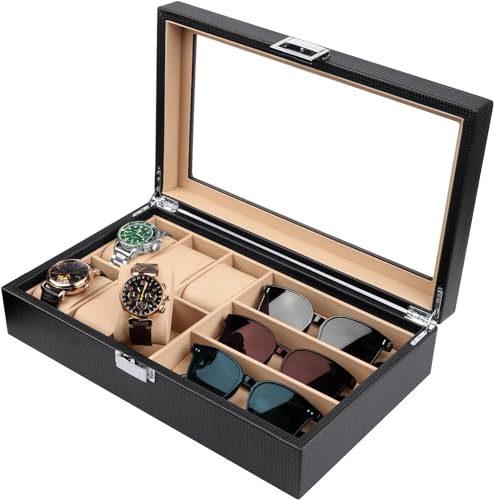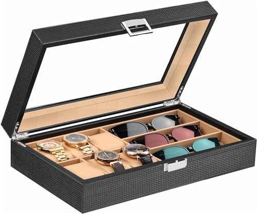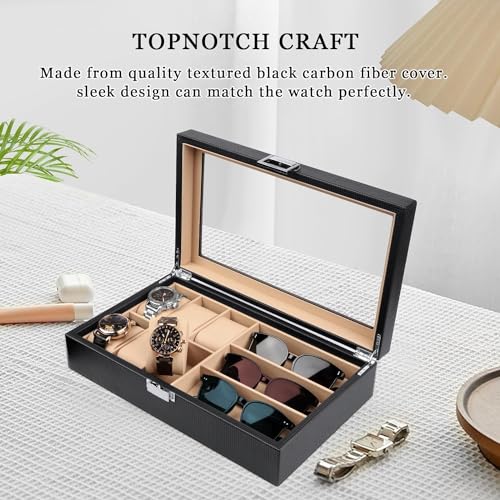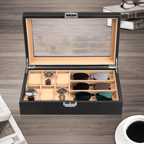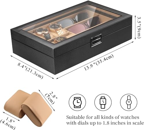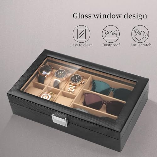 - غطاء كبير من الزجاج الحقيقي: منظم الساعات ونظارات الشمس هذا مزوّد بغطاء شفاف يمنحك رؤية واسعة لاختيار مقتنياتك المفضلة خلال ثواني، مع الحفاظ على الساعات والنظارات الشمسية محميةً من الغبار. وإذا كانت ساعتك تعمل بالطاقة الضوئية. فإن الضوء يمر من خلال الغطاء الزجاج لشحنها.