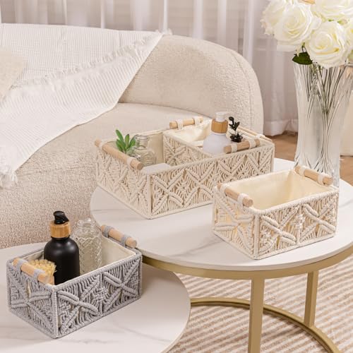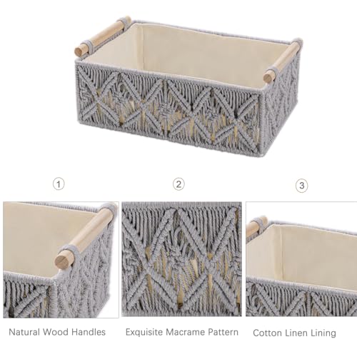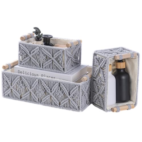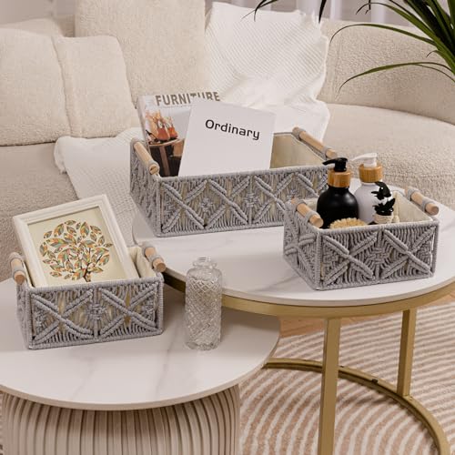 سلال تخزين مكرمية مصنوعة يدويًا بتصميم بوهيمي من فينجينز، سلال منسوجة من حبل القطن الطبيعي بمقابض خشبية، رف تخزين ديكور علوي لخزانة الحمام، منظم خزانة ورف - مجموعة من 3 قطع، لون رمادي
