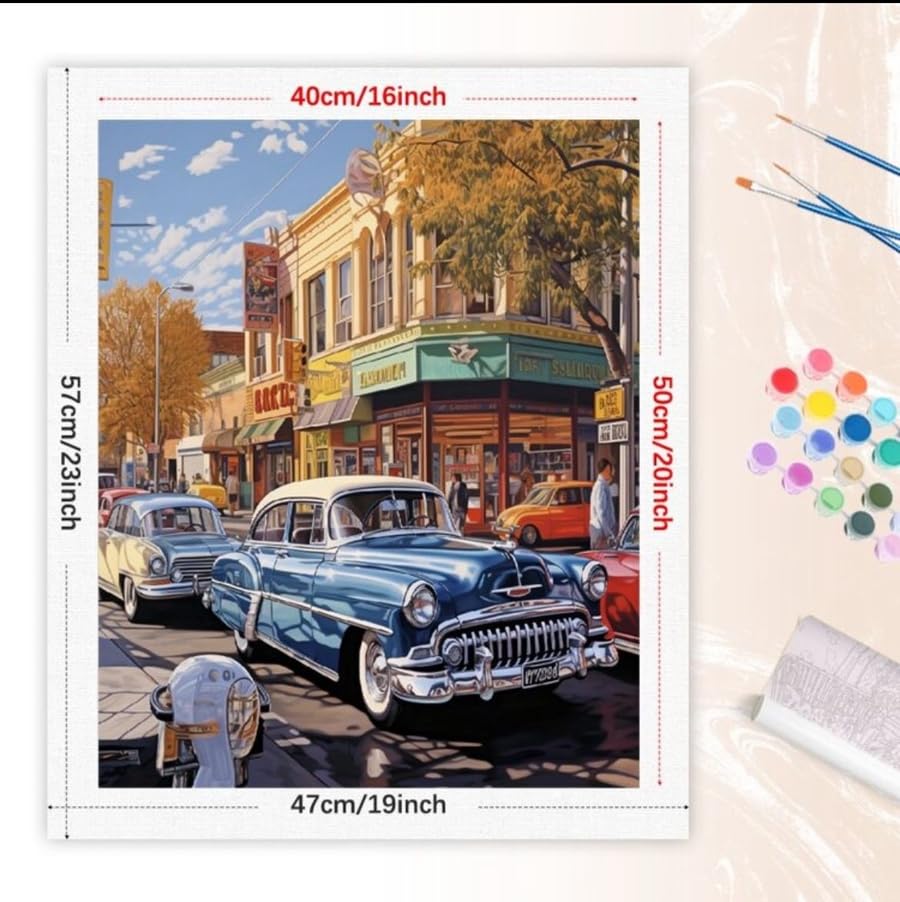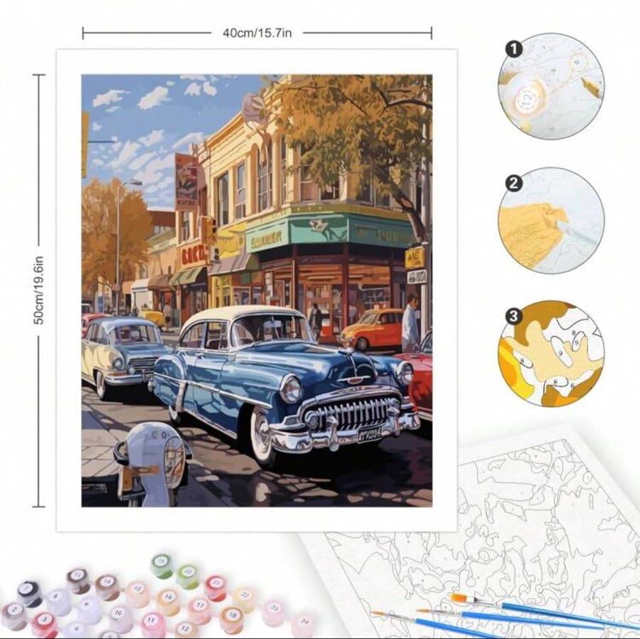 مجموعة التلوين حسب الأرقام بتصميم مشهد الشارع الكلاسيكي للسيارات، 40 × 50 سم، مجموعة فنية قماشية يمكنك تلوينها بنفسك مع فرش وألوان
