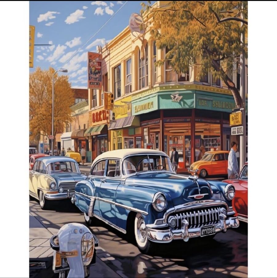 - تصميم عتيق: عمل فني كلاسيكي جميل لمشهد شارع السيارات يضم سيارات الخمسينيات وواجهات متاجر الحنين إلى الماضي، مثالية لعشاق السيارات