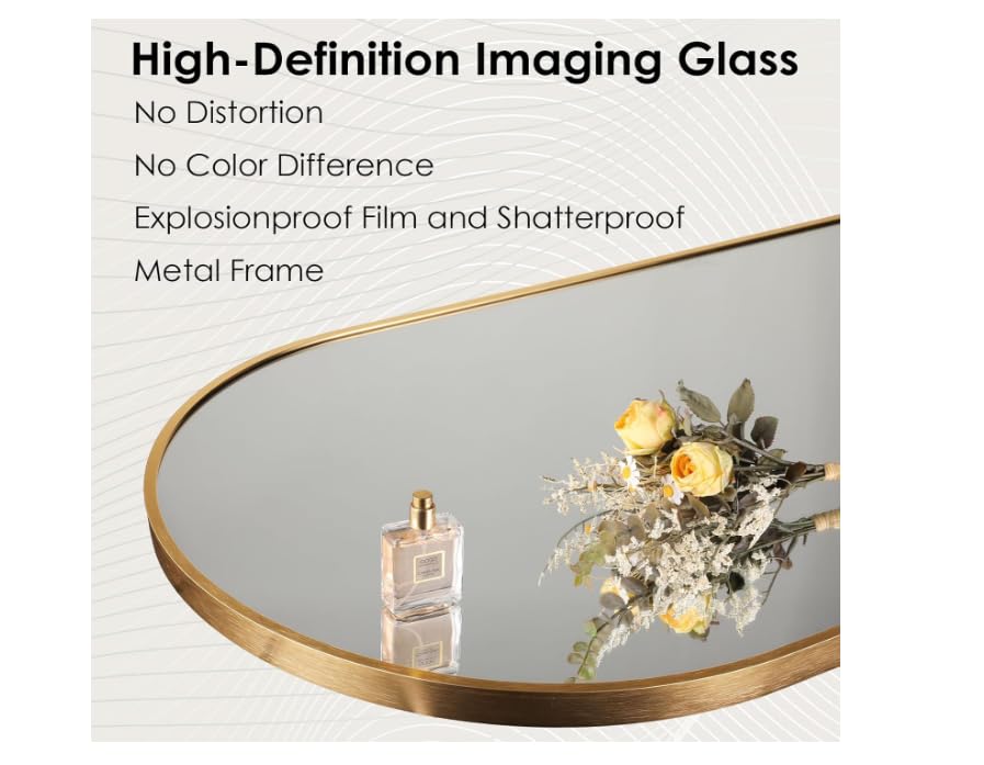 - إطار من الألومنيوم بتصميم قوس: يوفر الإطار المصنوع من الألومنيوم المتين حماية إضافية للمرآة وعمر خدمة طويل ويتميز بتصميم كلاسيكي متعدد الاستخدامات بحافة قوس باللونين الأسود والذهبي يناسب أي نمط غرفة.