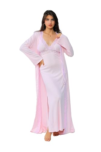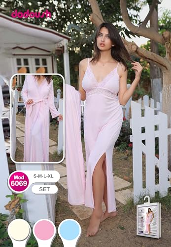 قميص نوم كامل للنساء من دعدوش - روب نوم للنساء مكون من قطعتين - ثوب نوم من البوليستر الناعم مع تطريز أنيق على الصدر - عباية ماكسي مطرزة نسائية