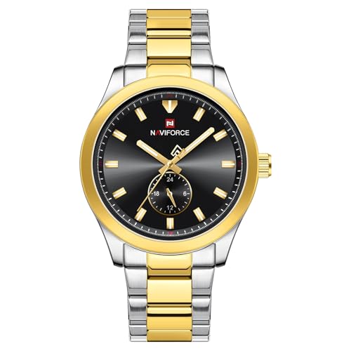 نافي فورس ساعة كوارتز انالوج للرجال - هيكل فضي، مينا ازرق، لمسات ذهبية، سوار ستيل، كرونوغراف، مقاومة للماء حتى عمق 30 متر، فضي-اسود-ذهبي