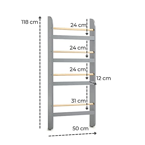 - الأبعاد - الارتفاع الكلي 118 سم، العرض الإجمالي 50 سم، العمق الإجمالي 12 سم. تتضمن خزانة الكتب ثلاثة أرفف ألعاب مقاس 24 سم ارتفاع × 50 سم عرض ورف واحد مقاس 31 سم ارتفاع × 50 سم عمق.