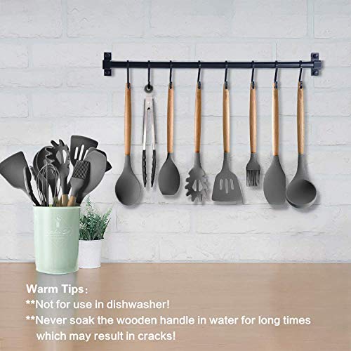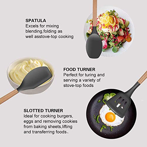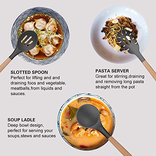 مجموعات أواني المطبخ ، 12 قطعة أواني الطبخ مجموعات سيليكون تشمل حاملات أواني - أدوات مطبخ غير لاصقة وغير قابلة للخدش مع مقبض خشبي